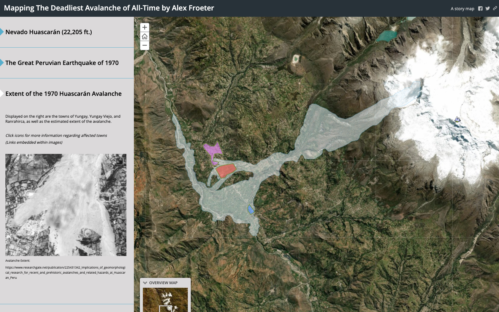 For my university's Web GIS course, I mapped the extent of what is considered to be the deadliest avalanche of all time, which occurred near the tallest mountain in Peru and entirely buried the town of Yungay, killing around 20,000 people. That avalanche has become known as the 1970 Huascarán Avalanche. I digitized the extent from a hand-drawn diagram found in a geological journal. I also created a Story Map to present the history of the disaster.