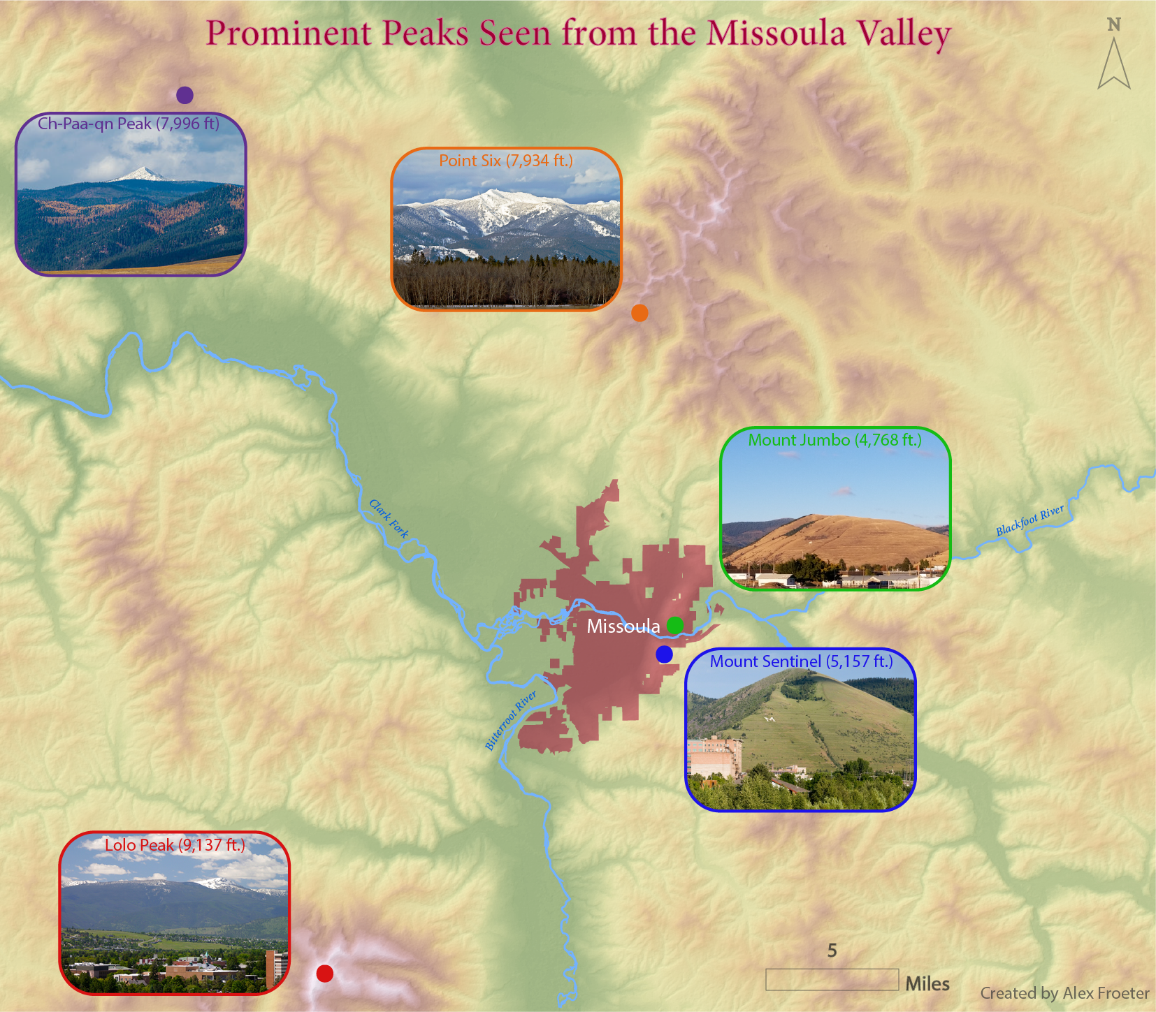 For my university's Advanced Cartographic Design course, we were assigned to create a map of Missoula, Montana for tourists. As the town is surrounded by mountains, I decided to design a guide for what tourists see when they look up. There are countless mountains visible from Missoula, but I determined the most recognizable and prominent peaks. I designed the map in the style of a tourist brochure, with bright colors and a simple artistic hillshade.